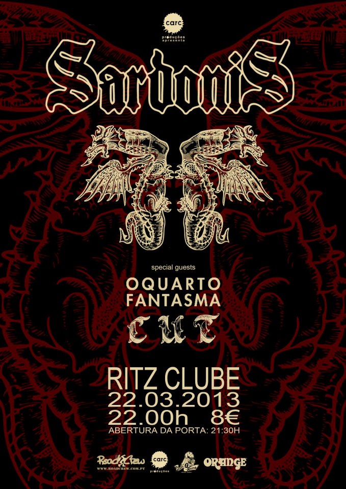 Sigam o rasto do Behemoth e venham ao encontro da irmandadade SardoniS, um exército belga de dois homens, que toca música instrumental pesada e ruidosa desde os idos de 2006. Com muita estrada debaixo dos pés e dois álbuns editados, o último "II" de Junho de 2012, andaram recentemente por terras do sol nascente em extensa tour, da qual resultou um disco em parceria com os titãs do doomrock Eternal Elysium. A abrir esta noite de vento negro, fogo e ferro dos SardoniS, O Quarto Fantasma, trio lisboeta de rock experimental. Amplamente instrumentais, as suas músicas exploram as dinâmicas entre o quase silêncio e explosões de som intensas. O seu disco de estreia sai este ano com o selo da Raging Planet. E ainda os Cut, trio que aposta sobretudo nas actuações ao vivo e prometem uma partilha de estados sensoriais inusitados.